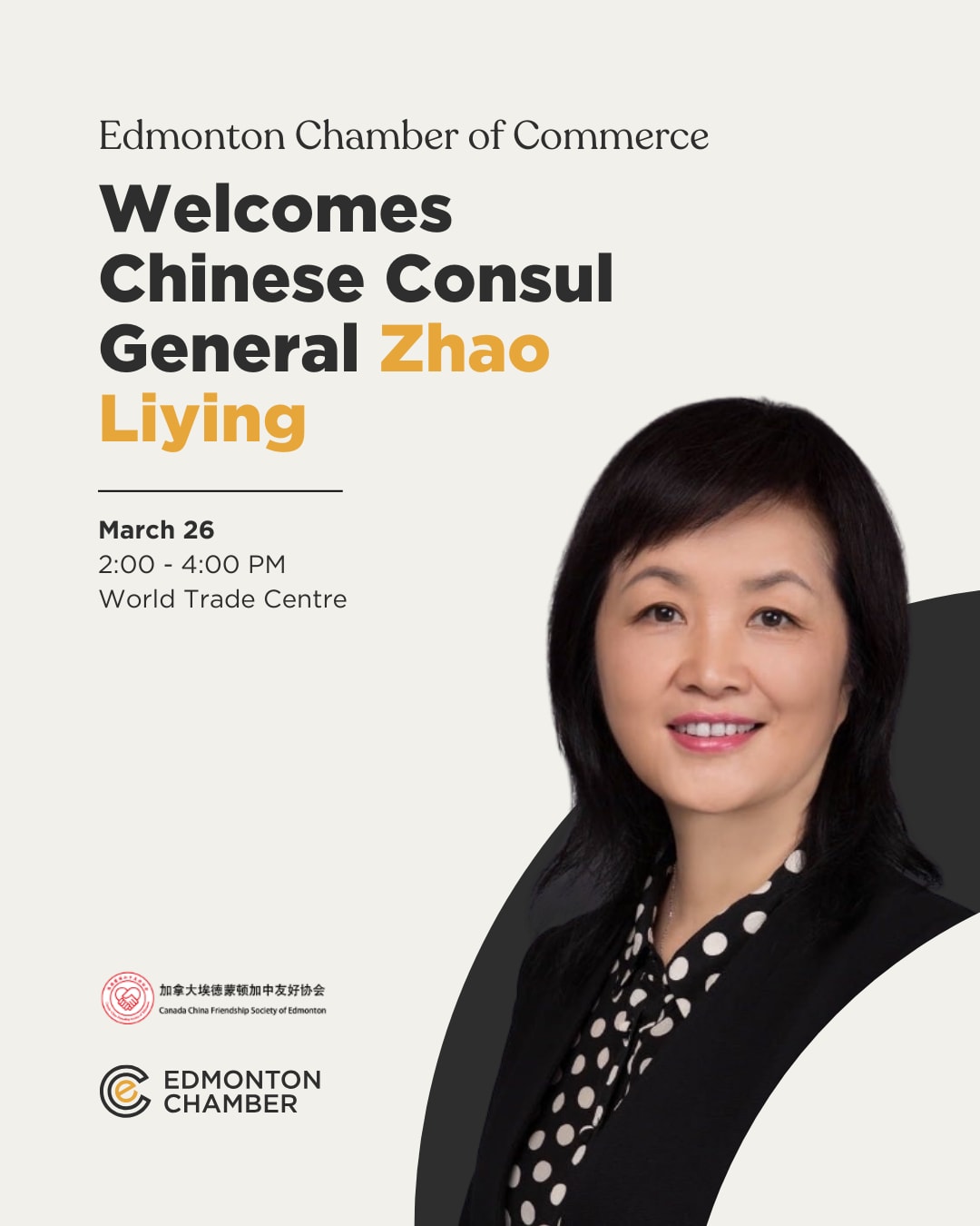 The Edmonton Chamber of Commerce is excited to host the Chinese Consul General, Zhao Liying. This event is in partnership with the Canada China Friendship Society, bringing people together for a focused business dialogue, panel, and networking mixer.