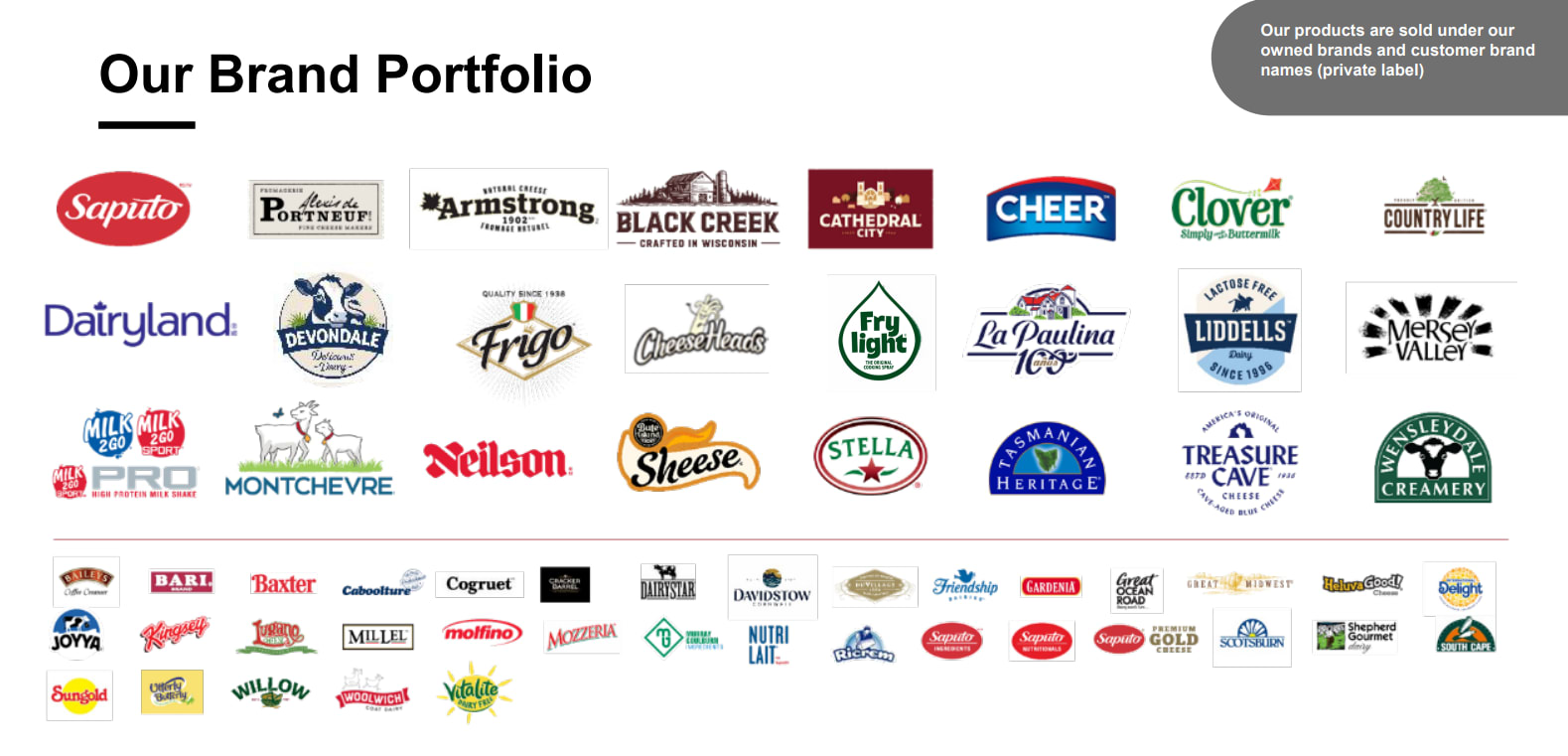 Saputo is a leading cheese manufacturer and fluid milk and cream processor in Canada, a leading dairy processor in Australia and the top dairy processor in Argentina. In the USA, Saputo ranks among the top three cheese producers and is one of the top producers of extended shelf-life and cultured dairy products. In the United Kingdom, Saputo is the leading manufacturer of branded cheese and dairy spreads. In addition to its dairy portfolio, Saputo produces, markets, and distributes a range of dairy alternative cheeses and beverages. Saputo products are sold in several countries under market-leading brands, as well as private label brands.